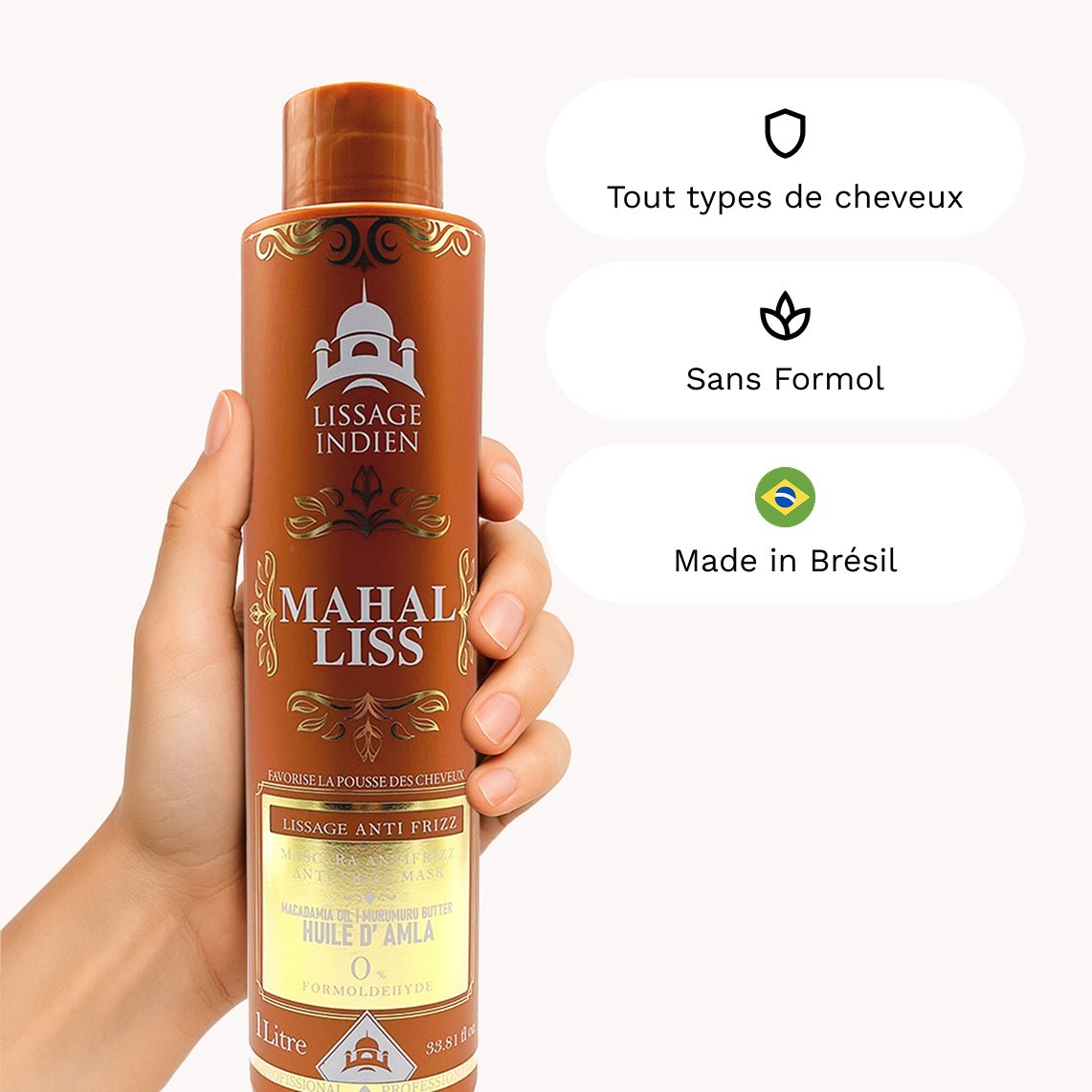 Le lissage indien Mahal Liss est aujourd’hui reconnu comme le plus efficace des lissages indiens. Enrichi en huile d’amla, huile de ricin et beurre de murumuru, il allie tradition ayurvédique et innovation capillaire pour lisser, nourrir et réparer tous les types de cheveux, même les plus rebelles. Sa formule sans formol, sans sulfate, sans parabène et sans silicone garantit un résultat brillant, souple et durable, digne d’un soin professionnel, à la maison comme en salon.