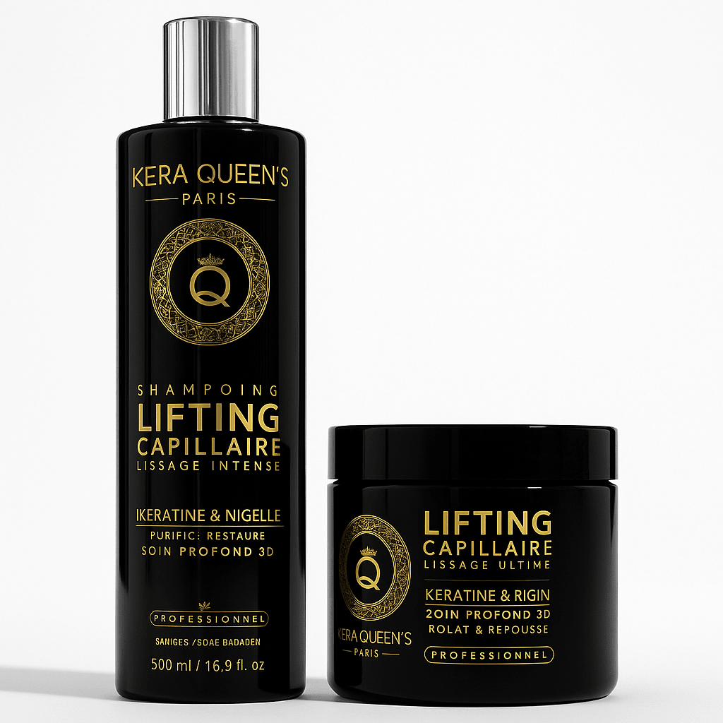 Kit Lifting Capillaire Professionnel Kera Queen’s Paris – Shampoing Kératine & Nigelle 500ml + Masque Kératine & Rigin Soin Profond 3D